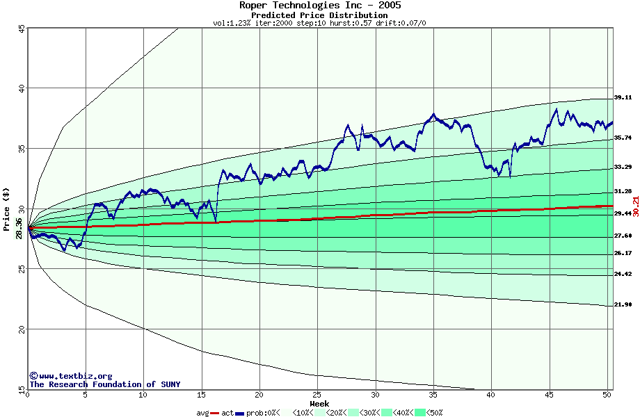 The following graph plots the year-to-date performance of the stock for 2005 compared to the probability calculated by a random walk model.
