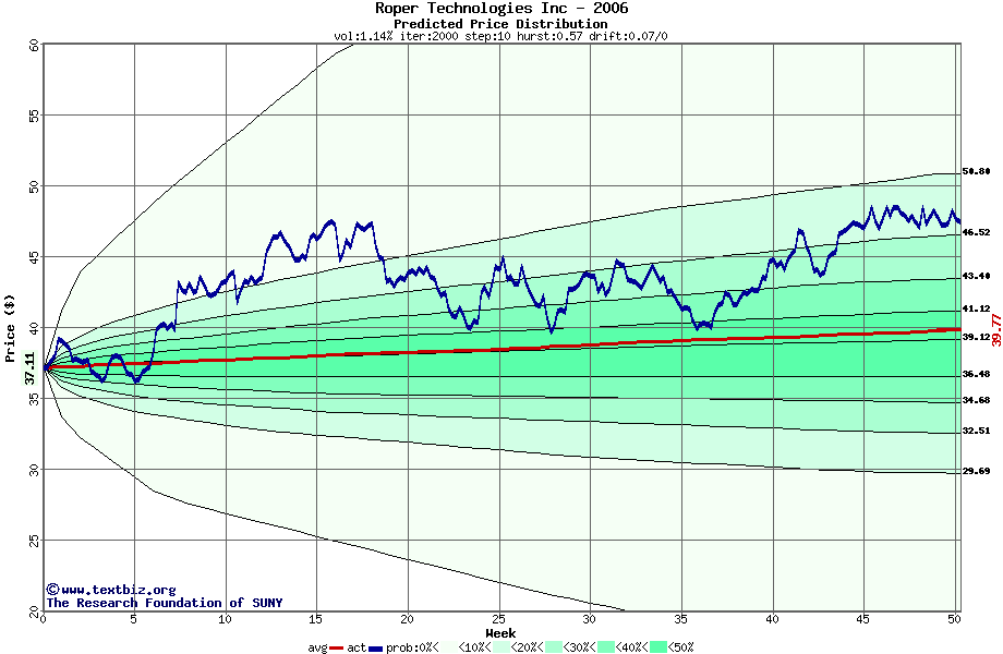 The following graph plots the year-to-date performance of the stock for 2006 compared to the probability calculated by a random walk model.