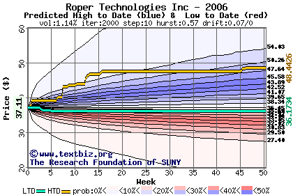 The high to date and low to date prices of the stock plotted against a random walk model for 2006 (what's this?).