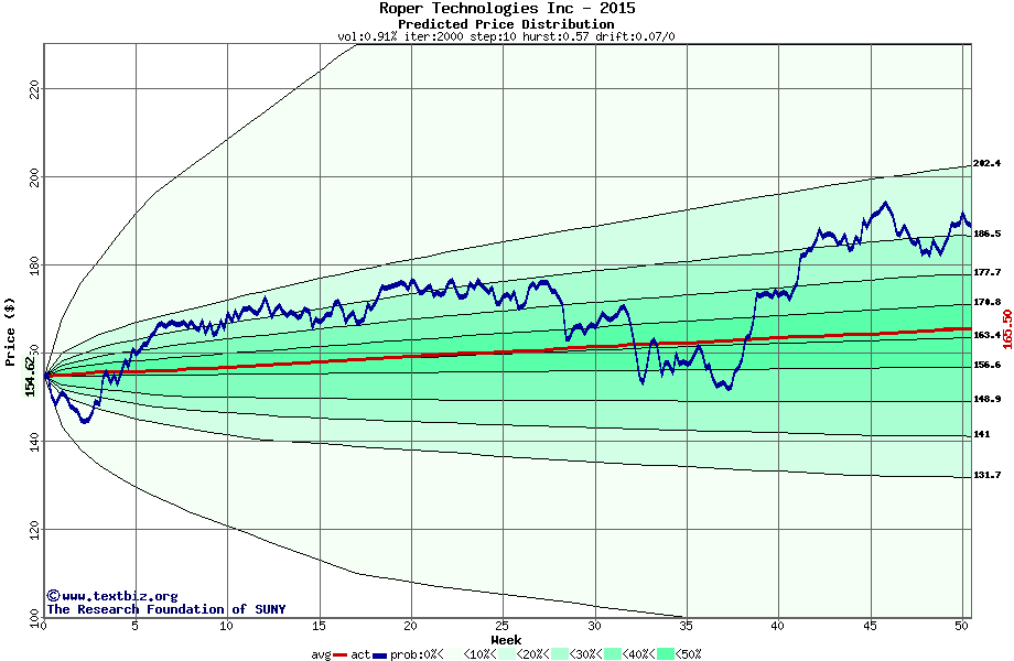 The following graph plots the year-to-date performance of the stock for 2015 compared to the probability calculated by a random walk model.