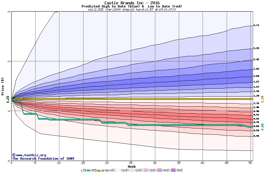 The high to date and low to date prices of the stock plotted against a random walk model for 2016 (what's this?).