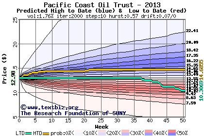The high to date and low to date prices of the stock plotted against a random walk model for 2013 (what's this?).