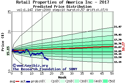 The high to date and low to date prices of the stock plotted against a random walk model for 2017 (what's this?).