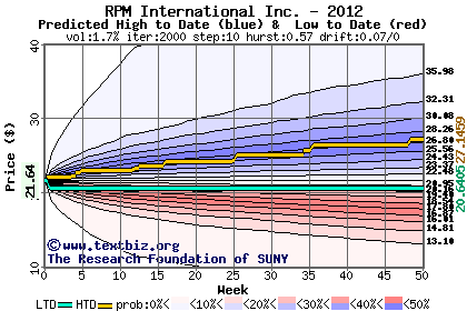 The high to date and low to date prices of the stock plotted against a random walk model for 2012 (what's this?).