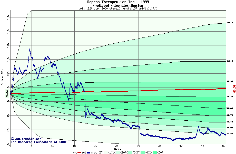 The following graph plots the year-to-date performance of the stock for 1999 compared to the probability calculated by a random walk model.