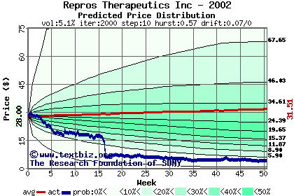 The high to date and low to date prices of the stock plotted against a random walk model for 2002 (what's this?).