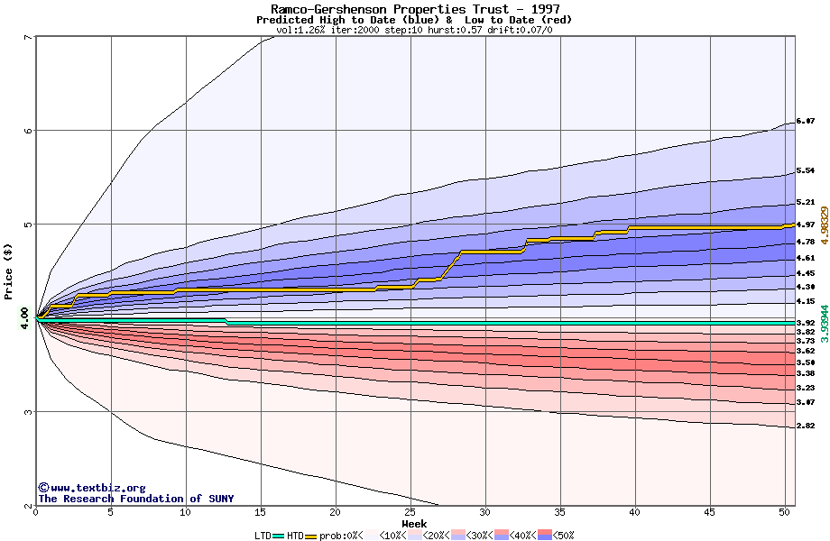 The high to date and low to date prices of the stock plotted against a random walk model for 1997 (what's this?).