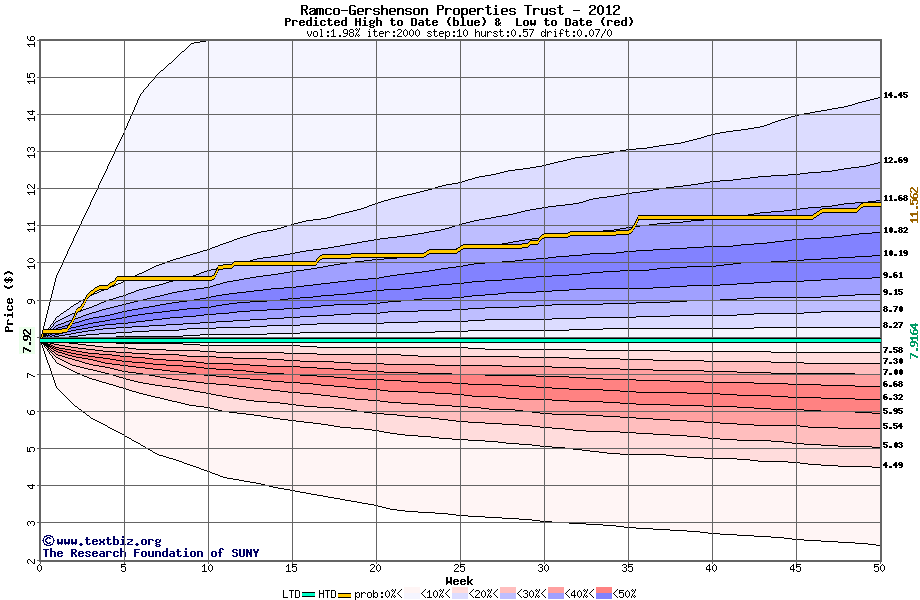 The following graph plots the year-to-date performance of the stock for 2012 compared to the probability calculated by a random walk model.