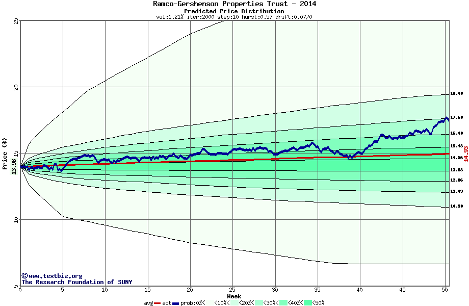 The following graph plots the year-to-date performance of the stock for 2014 compared to the probability calculated by a random walk model.