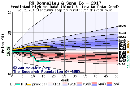 The high to date and low to date prices of the stock plotted against a random walk model for 2017 (what's this?).