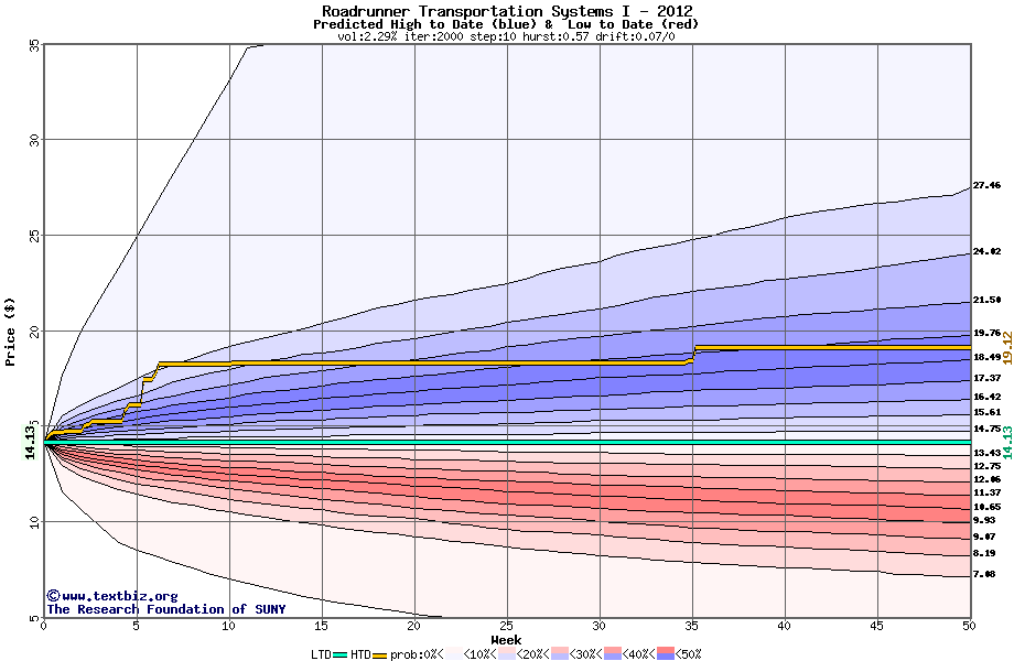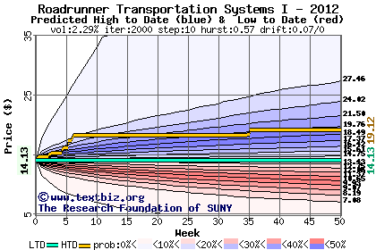 The high to date and low to date prices of the stock plotted against a random walk model for 2012 (what's this?).