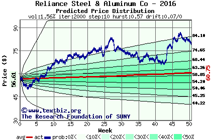 The high to date and low to date prices of the stock plotted against a random walk model for 2016 (what's this?).