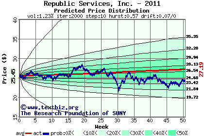 The high to date and low to date prices of the stock plotted against a random walk model for 2011 (what's this?).