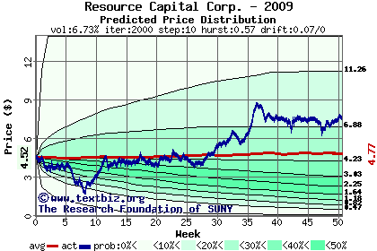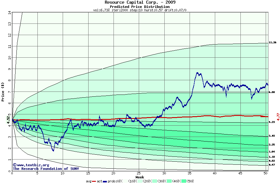 The following graph plots the year-to-date performance of the stock for 2009 compared to the probability calculated by a random walk model.
