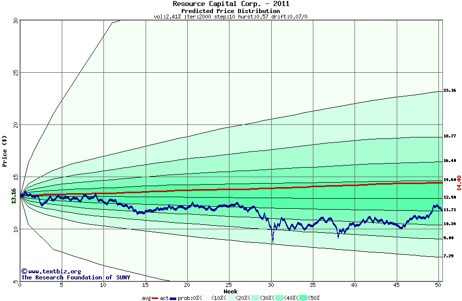 The high to date and low to date prices of the stock plotted against a random walk model for 2011 (what's this?).