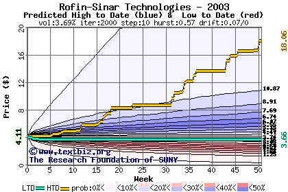 The high to date and low to date prices of the stock plotted against a random walk model for 2003 (what's this?).