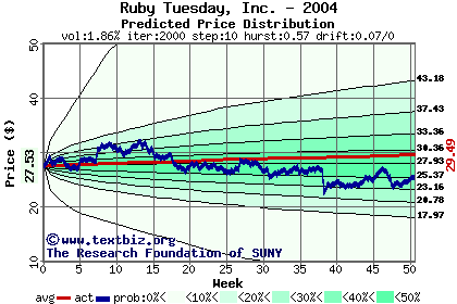 The following graph plots the year-to-date performance of the stock for 2004 compared to the probability calculated by a random walk model.