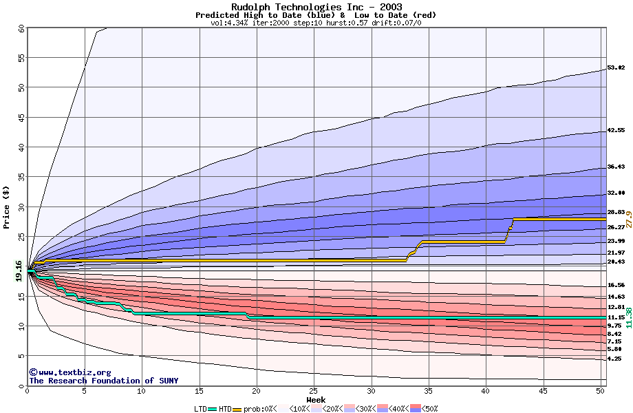 The following graph plots the year-to-date performance of the stock for 2003 compared to the probability calculated by a random walk model.