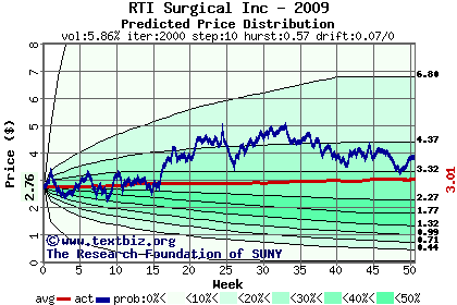 The high to date and low to date prices of the stock plotted against a random walk model for 2009 (what's this?).