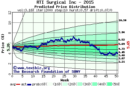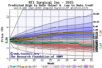 The high to date and low to date prices of the stock plotted against a random walk model for 2015 (what's this?).