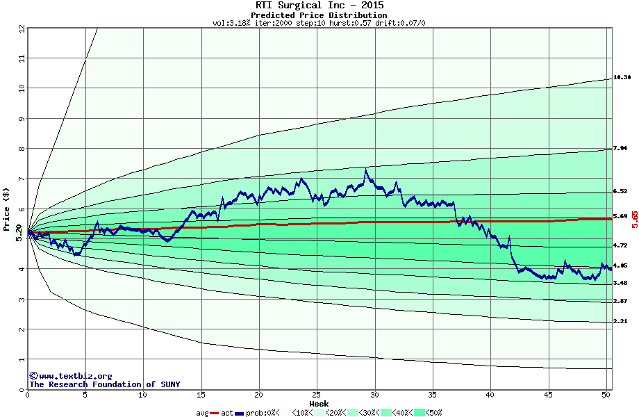 The following graph plots the year-to-date performance of the stock for 2015 compared to the probability calculated by a random walk model.