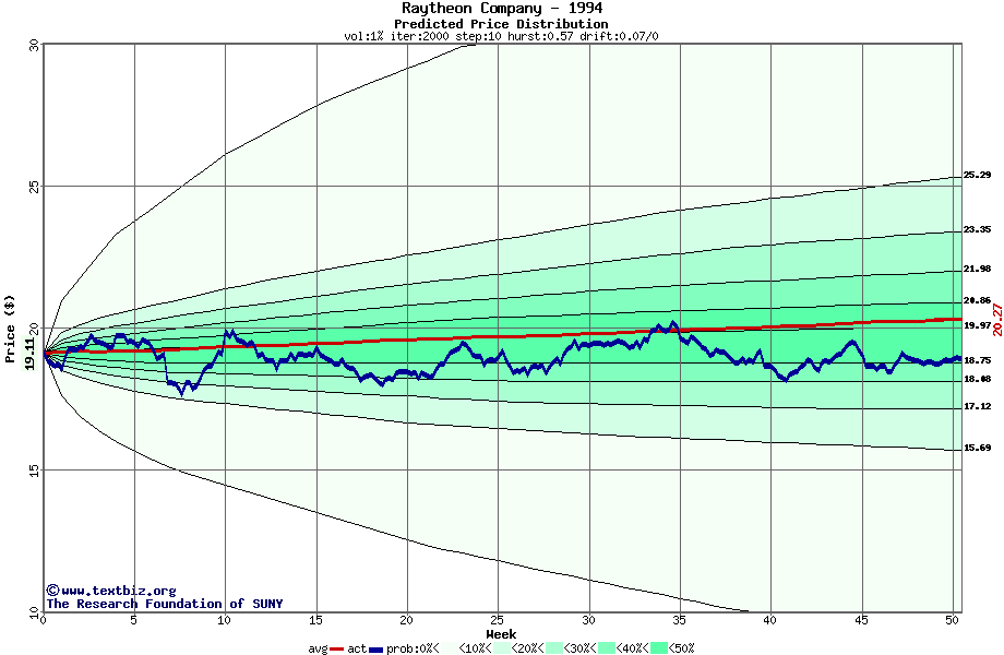 The following graph plots the year-to-date performance of the stock for 1994 compared to the probability calculated by a random walk model.