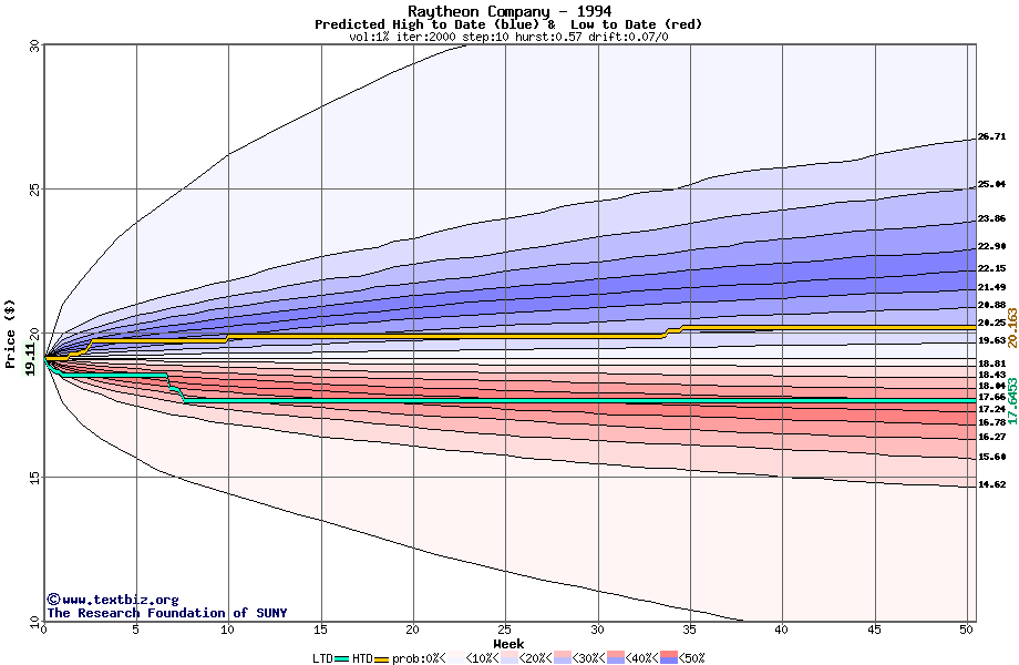 The high to date and low to date prices of the stock plotted against a random walk model for 1994 (what's this?).