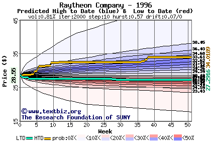The high to date and low to date prices of the stock plotted against a random walk model for 1996 (what's this?).