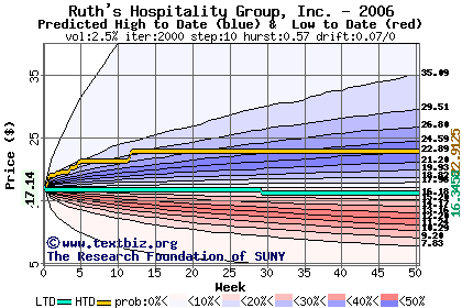 The high to date and low to date prices of the stock plotted against a random walk model for 2006 (what's this?).