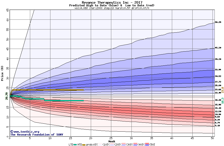 The high to date and low to date prices of the stock plotted against a random walk model for 2017 (what's this?).