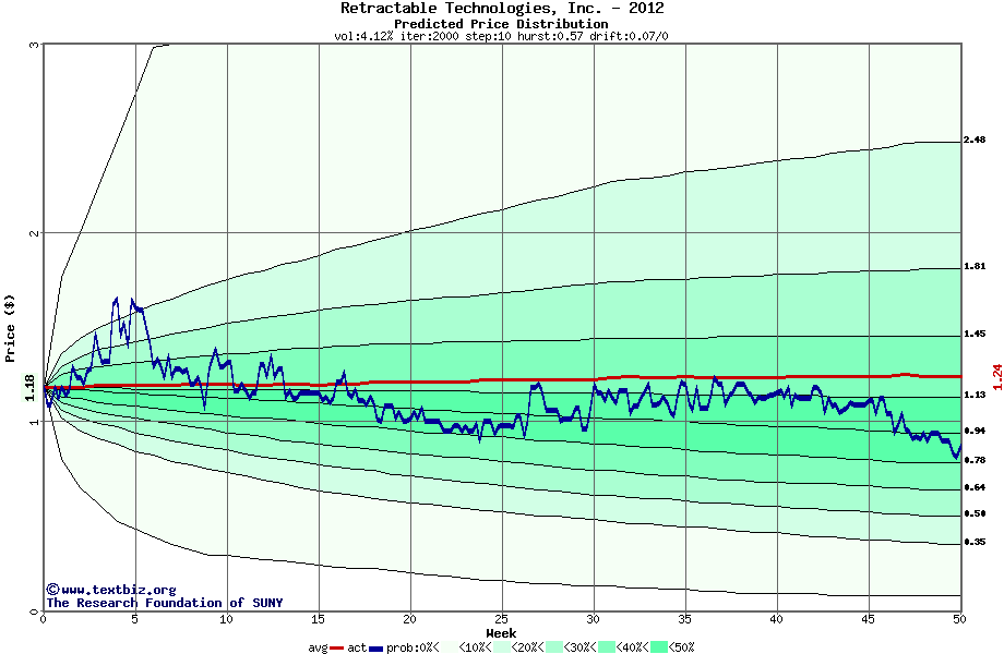 The high to date and low to date prices of the stock plotted against a random walk model for 2012 (what's this?).