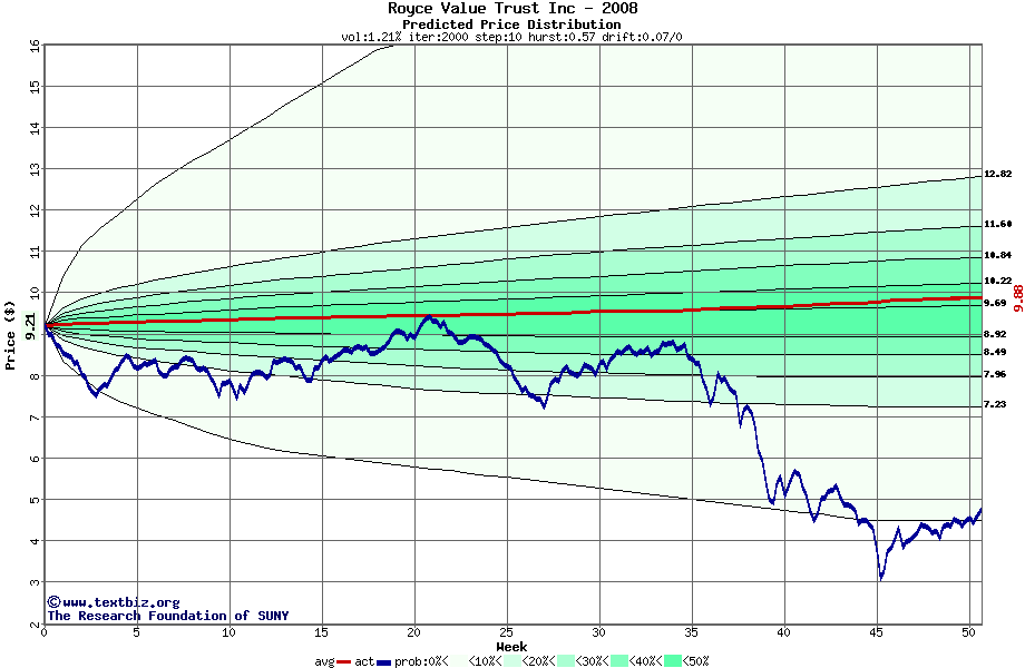 The following graph plots the year-to-date performance of the stock for 2008 compared to the probability calculated by a random walk model.