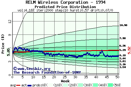 The high to date and low to date prices of the stock plotted against a random walk model for 1994 (what's this?).