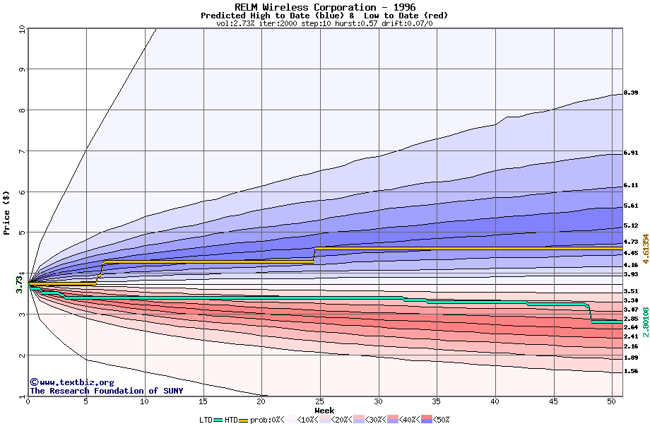 The high to date and low to date prices of the stock plotted against a random walk model for 1996 (what's this?).