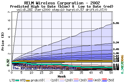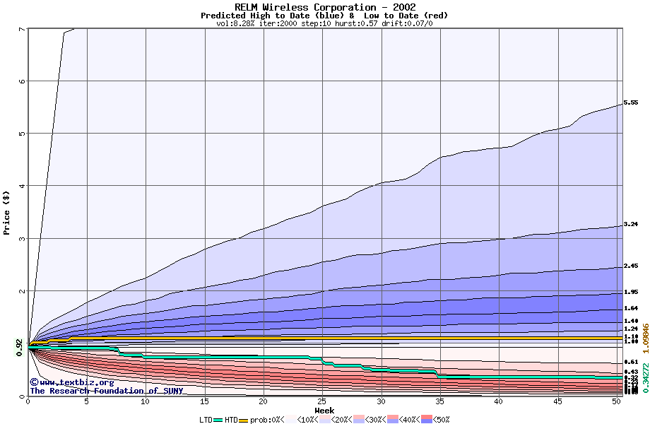 The high to date and low to date prices of the stock plotted against a random walk model for 2002 (what's this?).