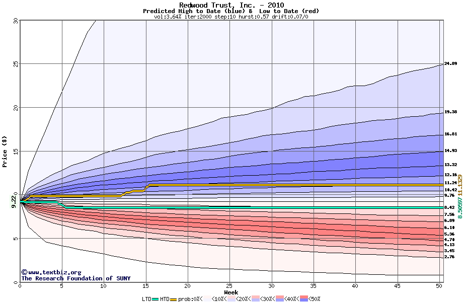 The high to date and low to date prices of the stock plotted against a random walk model for 2010 (what's this?).