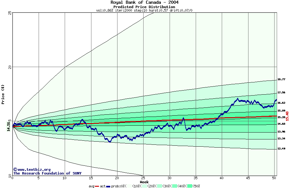 The following graph plots the year-to-date performance of the stock for 2004 compared to the probability calculated by a random walk model.