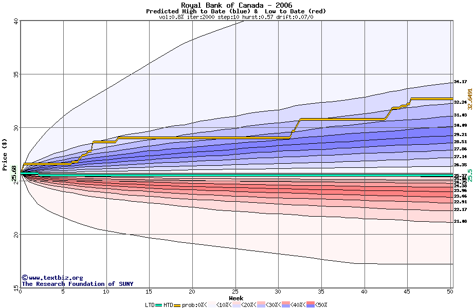 The high to date and low to date prices of the stock plotted against a random walk model for 2006 (what's this?).