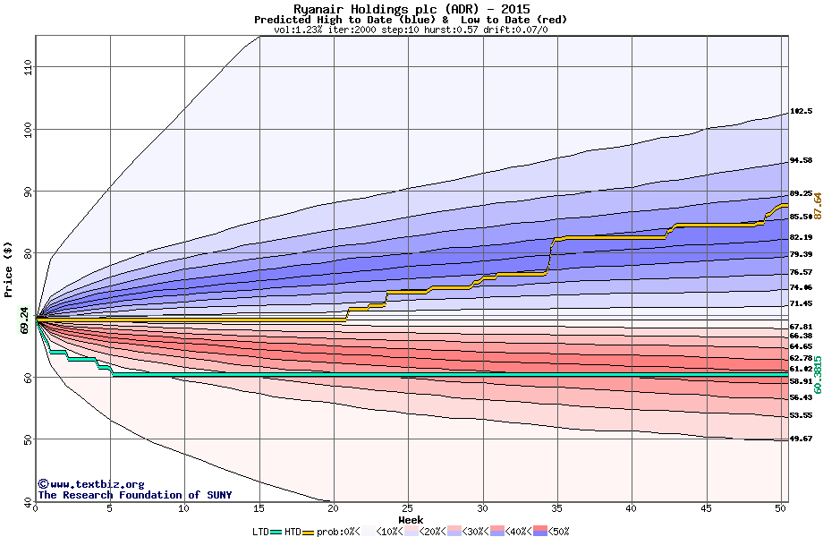 The high to date and low to date prices of the stock plotted against a random walk model for 2015 (what's this?).