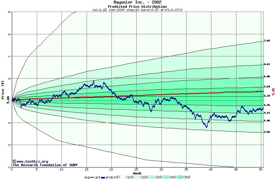 The following graph plots the year-to-date performance of the stock for 2002 compared to the probability calculated by a random walk model.