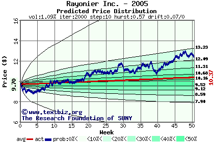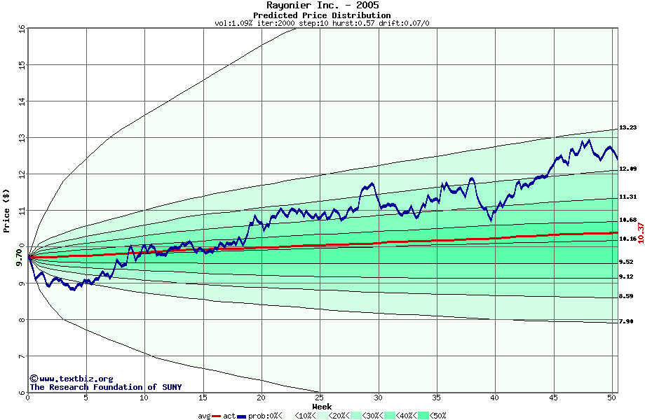 The following graph plots the year-to-date performance of the stock for 2005 compared to the probability calculated by a random walk model.