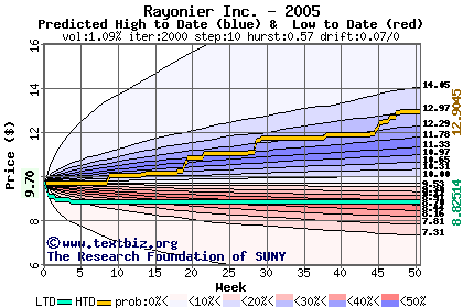 The high to date and low to date prices of the stock plotted against a random walk model for 2005 (what's this?).