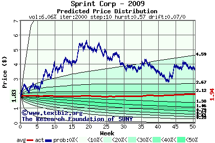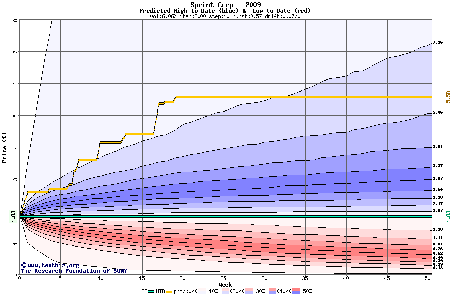 The high to date and low to date prices of the stock plotted against a random walk model for 2009 (what's this?).