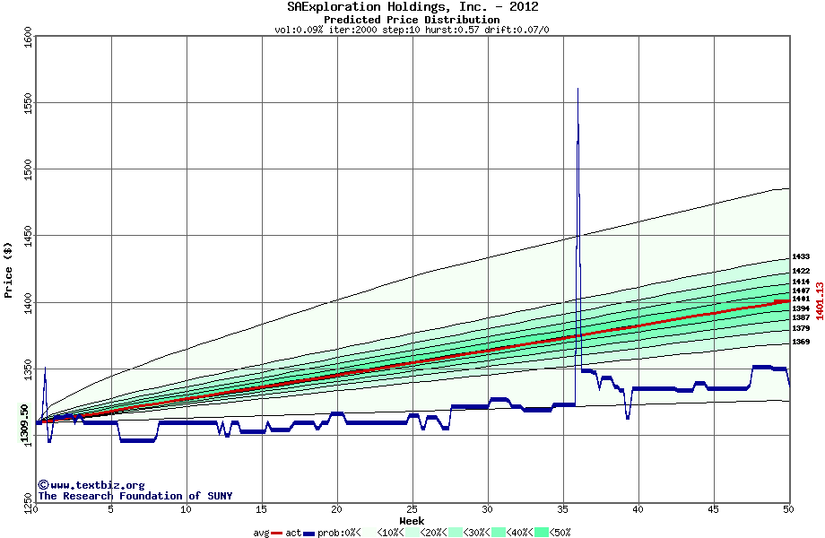 The following graph plots the year-to-date performance of the stock for 2012 compared to the probability calculated by a random walk model.