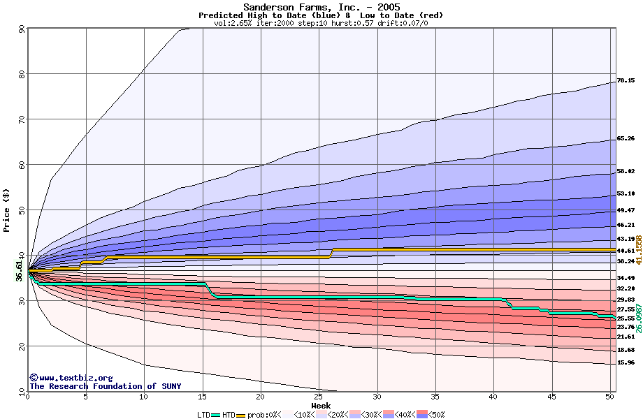 The high to date and low to date prices of the stock plotted against a random walk model for 2005 (what's this?).