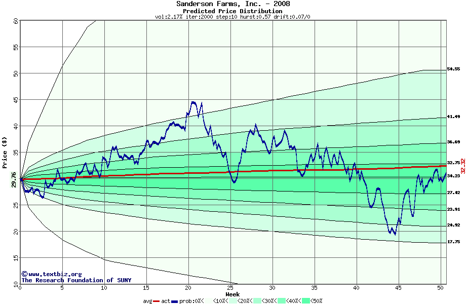 The following graph plots the year-to-date performance of the stock for 2008 compared to the probability calculated by a random walk model.