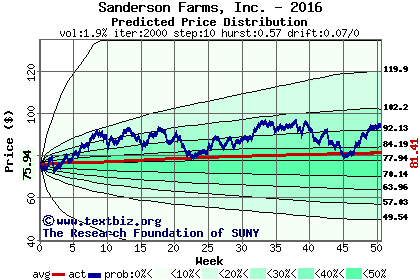 The following graph plots the year-to-date performance of the stock for 2016 compared to the probability calculated by a random walk model.