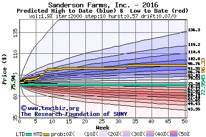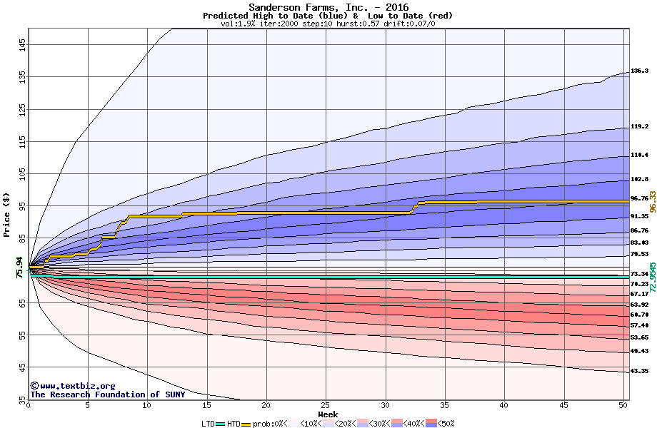 The high to date and low to date prices of the stock plotted against a random walk model for 2016 (what's this?).