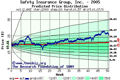 The following graph plots the year-to-date performance of the stock for 2005 compared to the probability calculated by a random walk model.