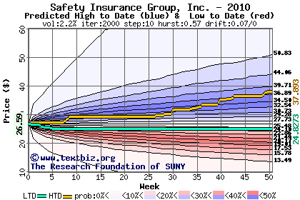 The high to date and low to date prices of the stock plotted against a random walk model for 2010 (what's this?).